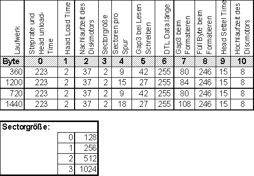 Die Bits 0 bis 3 ist die Kopfabhebezeit [ ms ] und ist als Faktor von 16 angegeben.